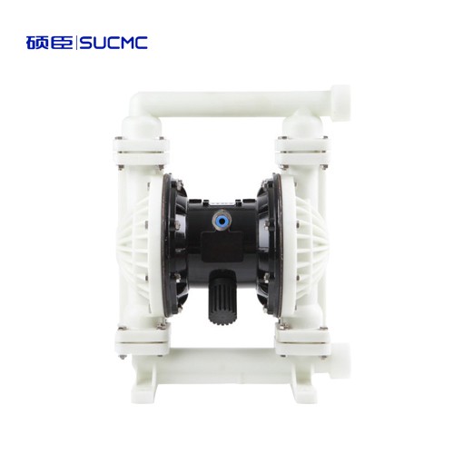 在隔膜泵的两个对称工作腔中,各装有一块有弹性的隔膜,联杆将两块隔膜结成一体,压缩空气从泵的进气接头1进入配气阀3后,推动两个工作腔内的隔膜,驱使联杆联接的两块隔膜同步运动。与此同时,另一工作腔中的气体则从隔膜的背后排出泵外。一旦到达行程终点。配气机构则自动地将压缩空气引入另一个工作腔,推动隔膜朝相反方向运动,这样就形成了两个隔膜的同步往复运动。每个工作腔中设置有两个单向球阀4,隔膜的往复运动,造成工作腔内容积的改变,迫使两个单向球阀交替地开启和关闭,从而将液体连续地吸入和排出。