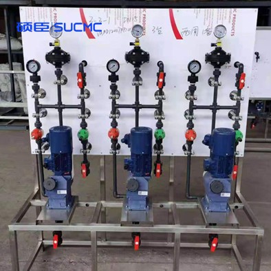 水处理加药装置由计量泵及脉冲阻尼器、背压阀、安全阀等附件及管路支架组成。三台计量泵两用一备,防止在使用过程中出现故障时能够及时替换工作。水处理加药装置接入现场加药箱就可以工作,安装简单,使用方便,有效地提高工作效率。