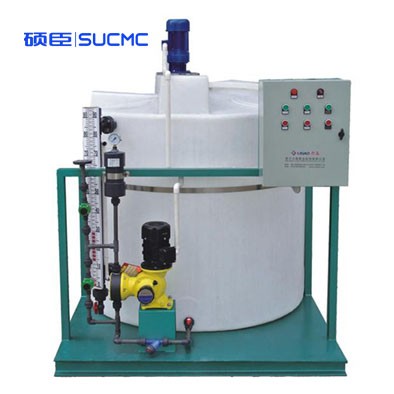 固体药剂加入溶药箱内,然后按比例加入工业水搅拌溶解,由计量投加系统投加到投药点。投加控制可采用手动方式,也可依据上位系统输出的控制信号.进行随动控制,自动投加。